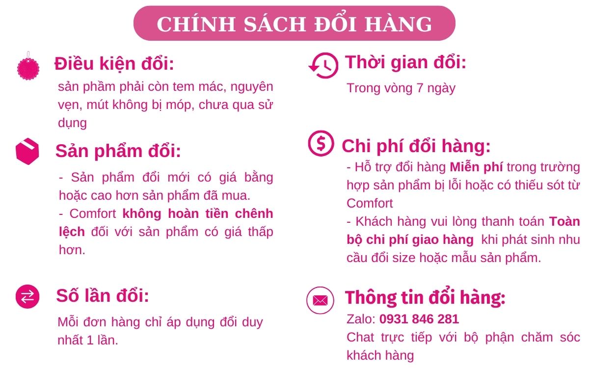 - Qúy Khách sẽ được đổi mẫu và size, tuy nhiên khi nhận hàng đúng đơn (mẫu, size, màu) khách đặt là nhận hàng, không trả hàng.
